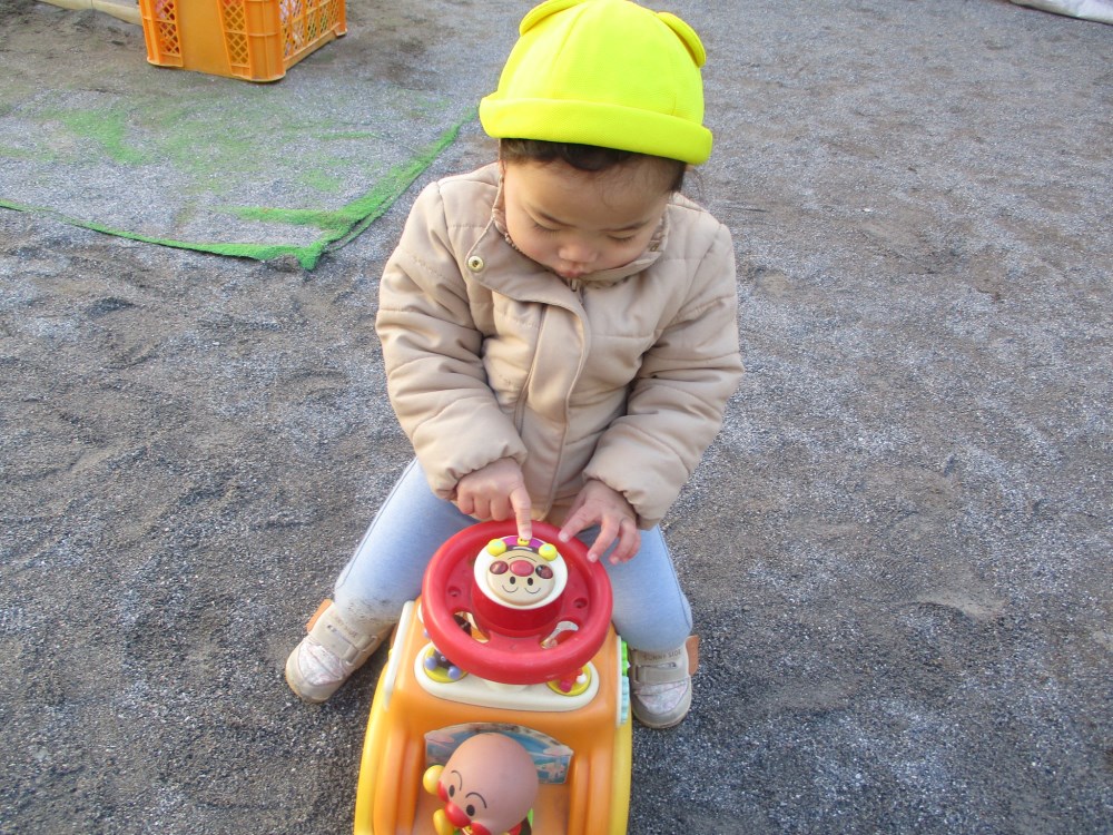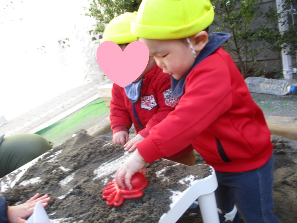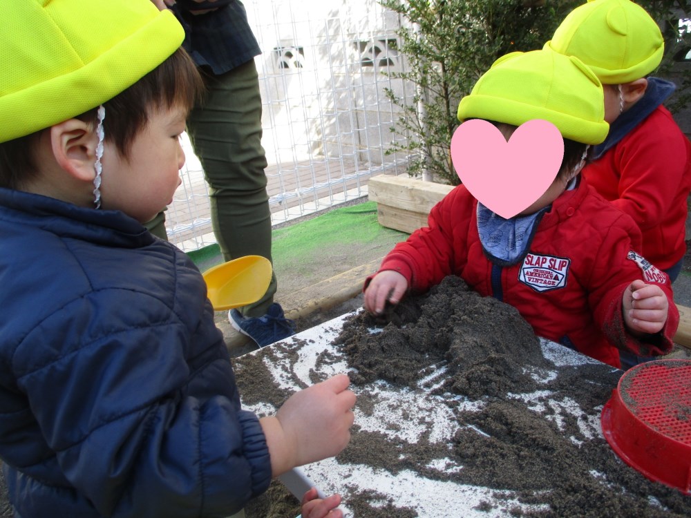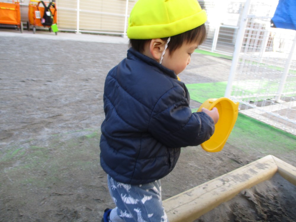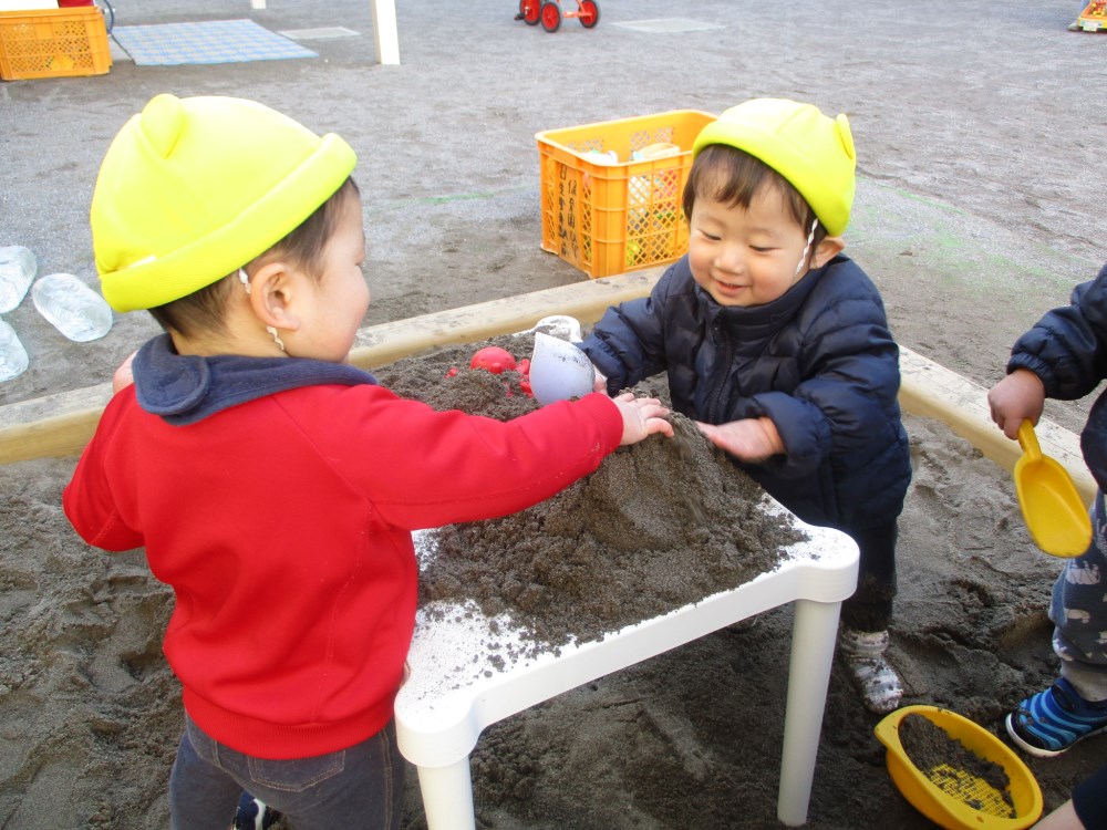 こんにちは 日生曳舟駅前保育園ひびきです ひよこさんが園庭で遊んだ時の様子をお伝えします 砂場で先生が砂のケーキを作ってくれると・・・ とってもいい笑顔♡ 嬉しそうに遊んでいました!! 寒さなんて関係ない!! 元気いっぱい遊んだひよこさんでした♡