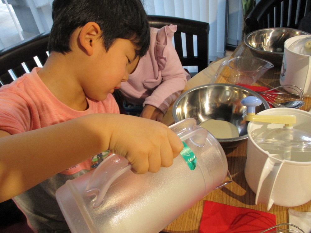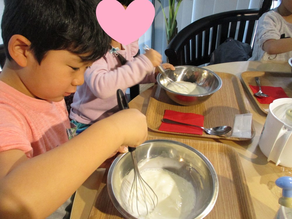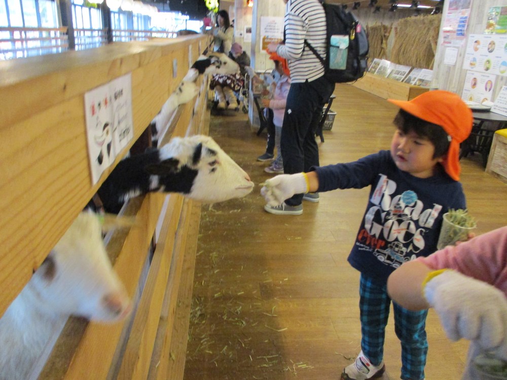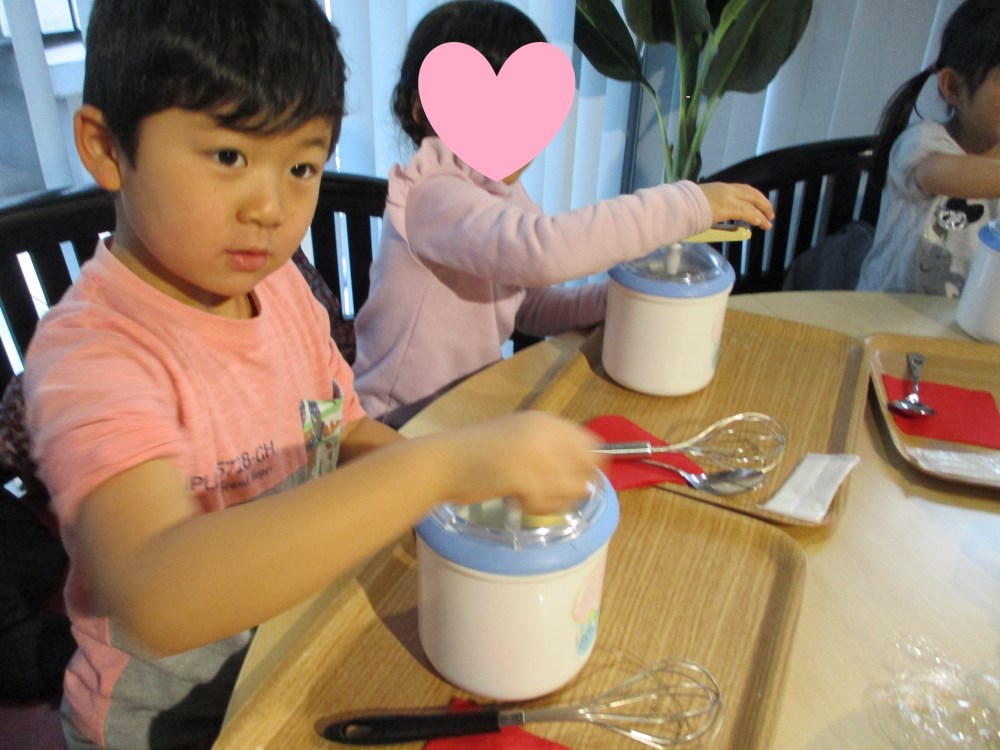 こんにちは 日生曳舟駅前保育園ひびきです ぱんださんときりんさんで以前行った「大手町牧場」にアイスクリーム作り体験に行ってきました!! 今回も動物にえさやりをし・・・ いざ、体験スタート!! 真剣な表情です♡ 大満足の笑顔♡
