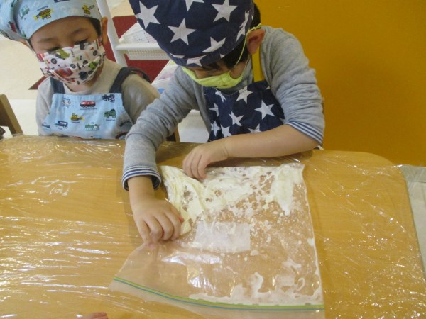 つるんとした生地になるように、みんなで協力してもみもみします♪