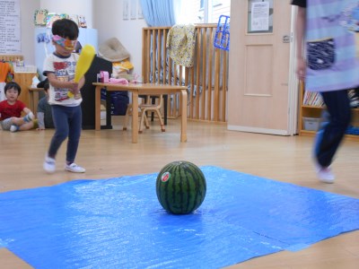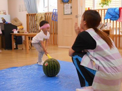 目隠しをしながら、お友だちの声を頼りに頑張っています!