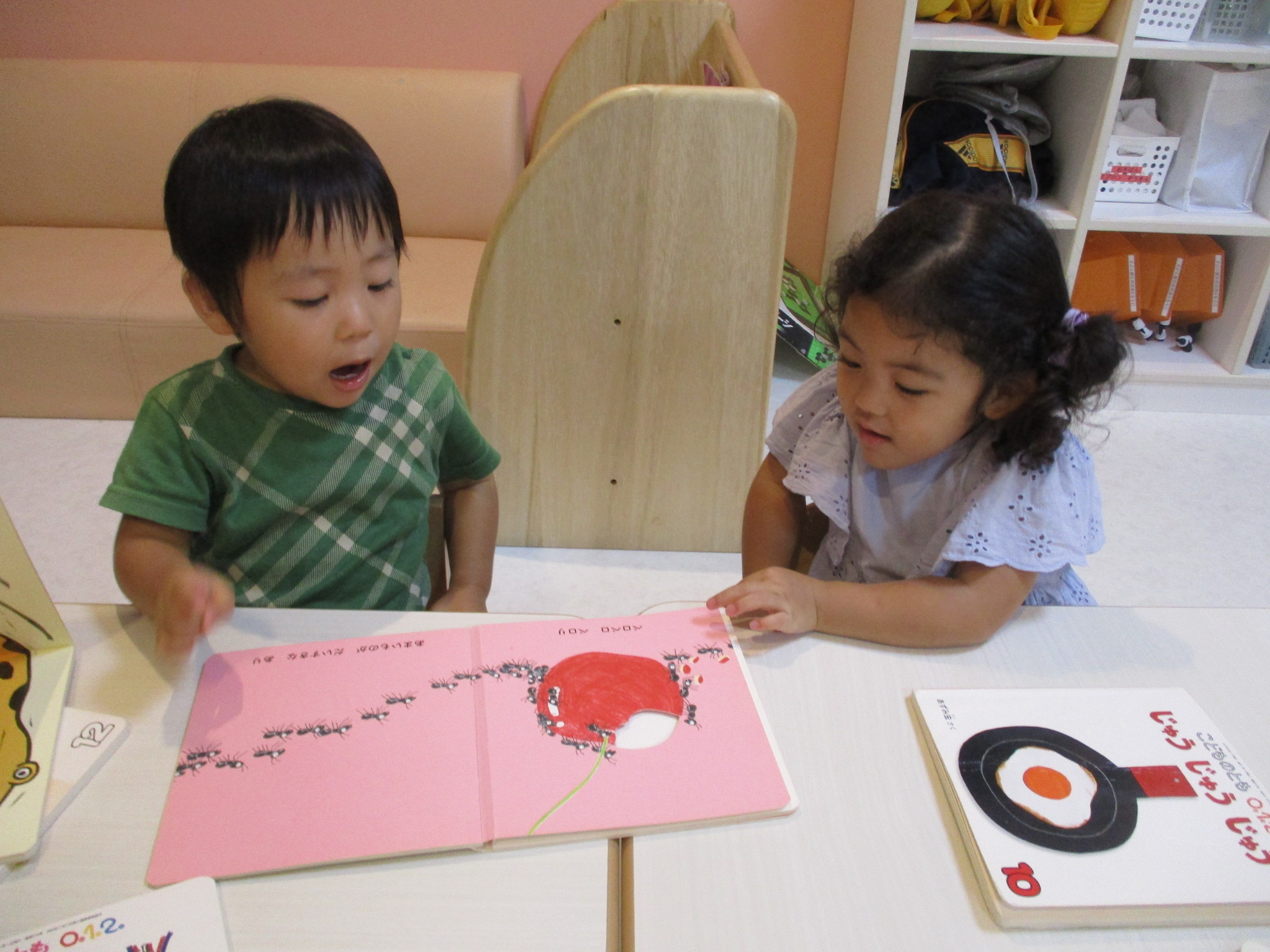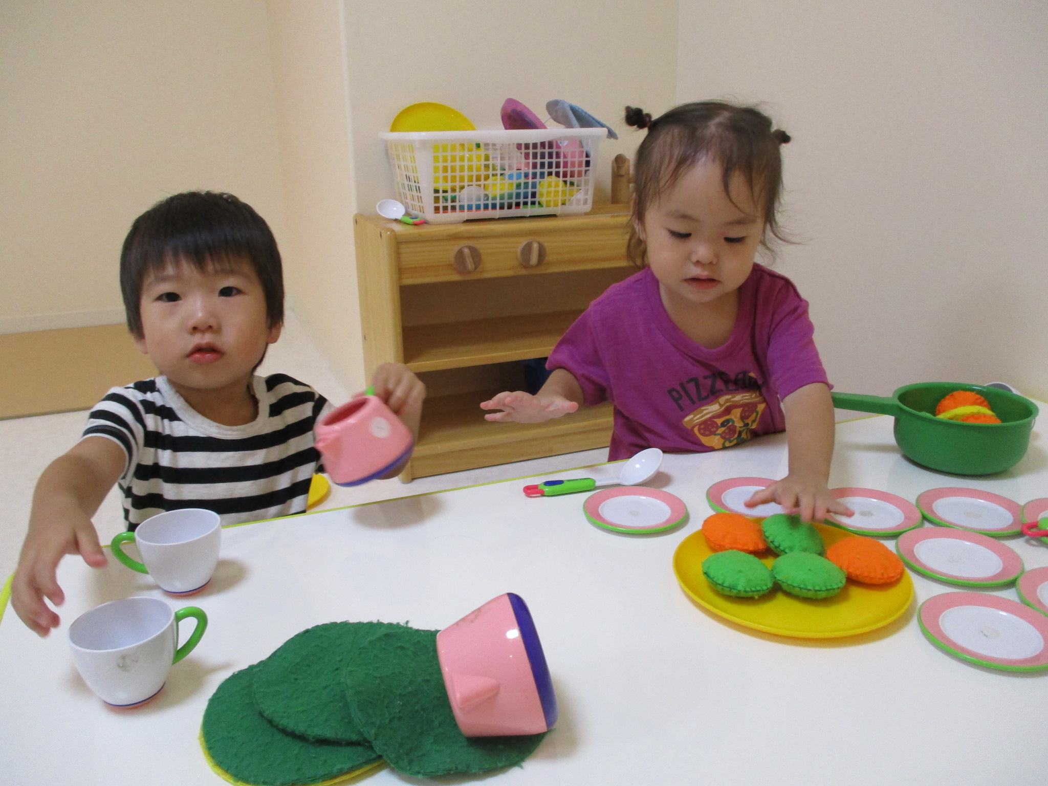 子どもたちは、コーナーに分かれて遊んでいて、絵本を見る子、おままごとをする子、ブロックをする子…などみんな思い思いの遊びを楽しんでいます。