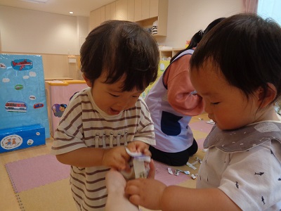 今回は1歳児ひかり組さんがお部屋で新聞紙遊びをしていた様子をご紹介します♪