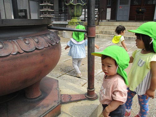 水場では保育者が話しをして手を洗うところだよと伝えると興味をもっている子が多くいました。
