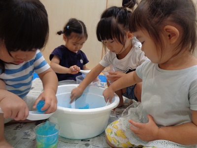 昨日2歳児つき組が寒天遊びをしたのでご紹介します。