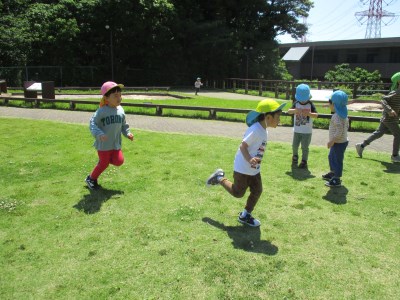 公園へ着いてすぐに広い芝の上を思いきり走る子どもたち。