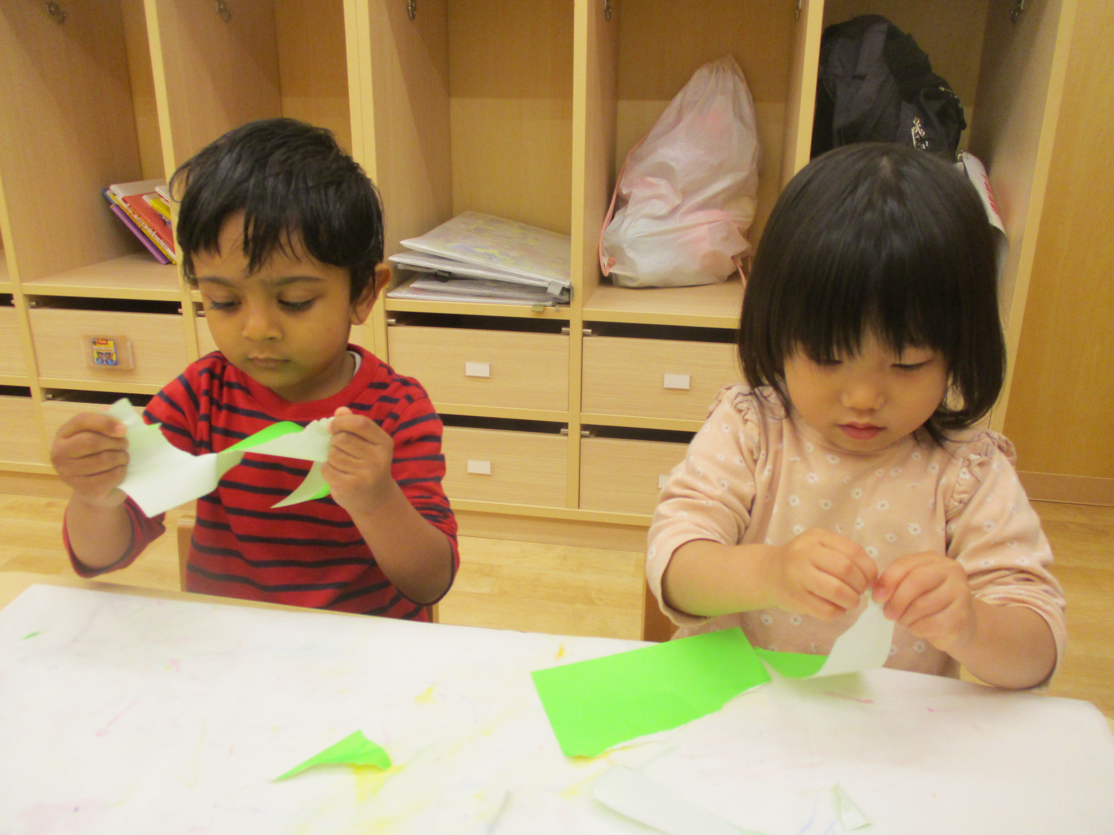 次は5月の製作での一枚。折り紙をちぎったり、タンポを使って