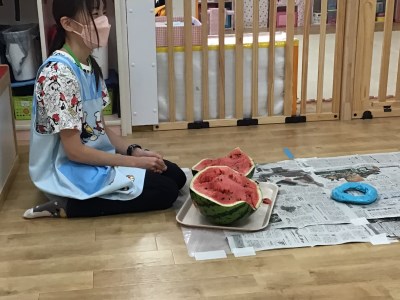 大きくて冷たいすいかにビックリしながらも触ったり叩いたりして感触を楽しんでいました(*^^*)