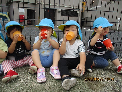 園庭で遊ぶ際には水筒を持っていき、水分補給をしています。