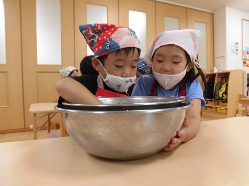 今日はにじ組で「米研ぎ」の食育を行いました。
