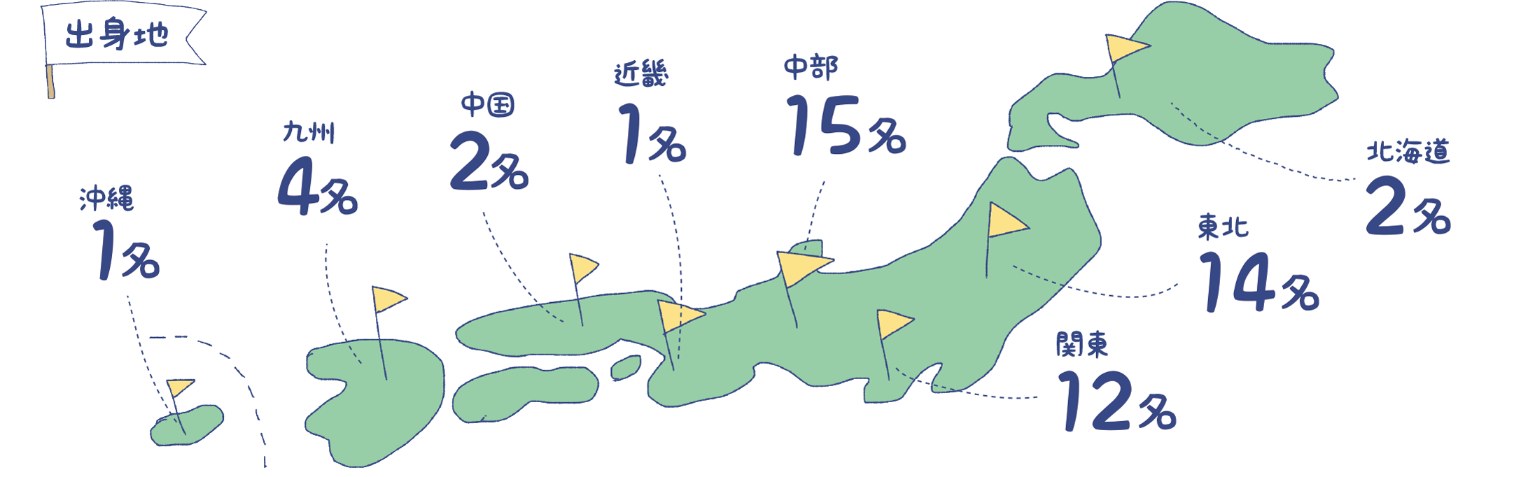 北海道6名、東北12名、関東18名、中部12名、近畿1名、中国1名、九州3名、沖縄2名