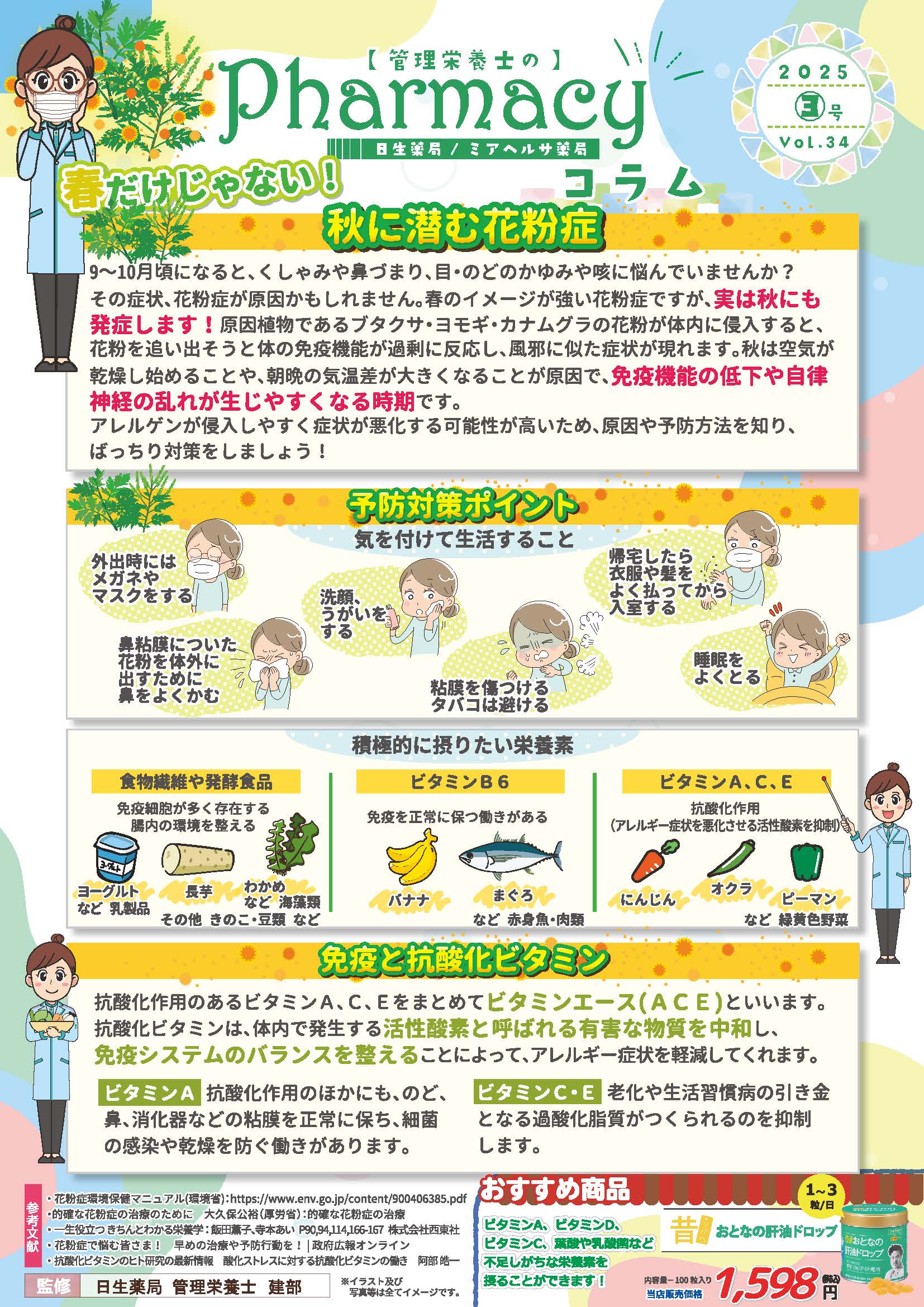 2025年10月01日 管理栄養士による「Pharmacyコラム」および「おすすめレシピ」を更新しました。 2025年 3号は、下記よりご確認ください。 ※画像をクリックするとPDFファイルが開きます。 日生薬局・ミアヘルサ薬局では、薬剤師による薬のサポートに加え、管理栄養士による栄養相談を実施し、より充実した健康サポートを行なっています。今後も、患者さまの利便性の向上や医療の質の向上に寄与する取り組みを積極的に進めてまいります。