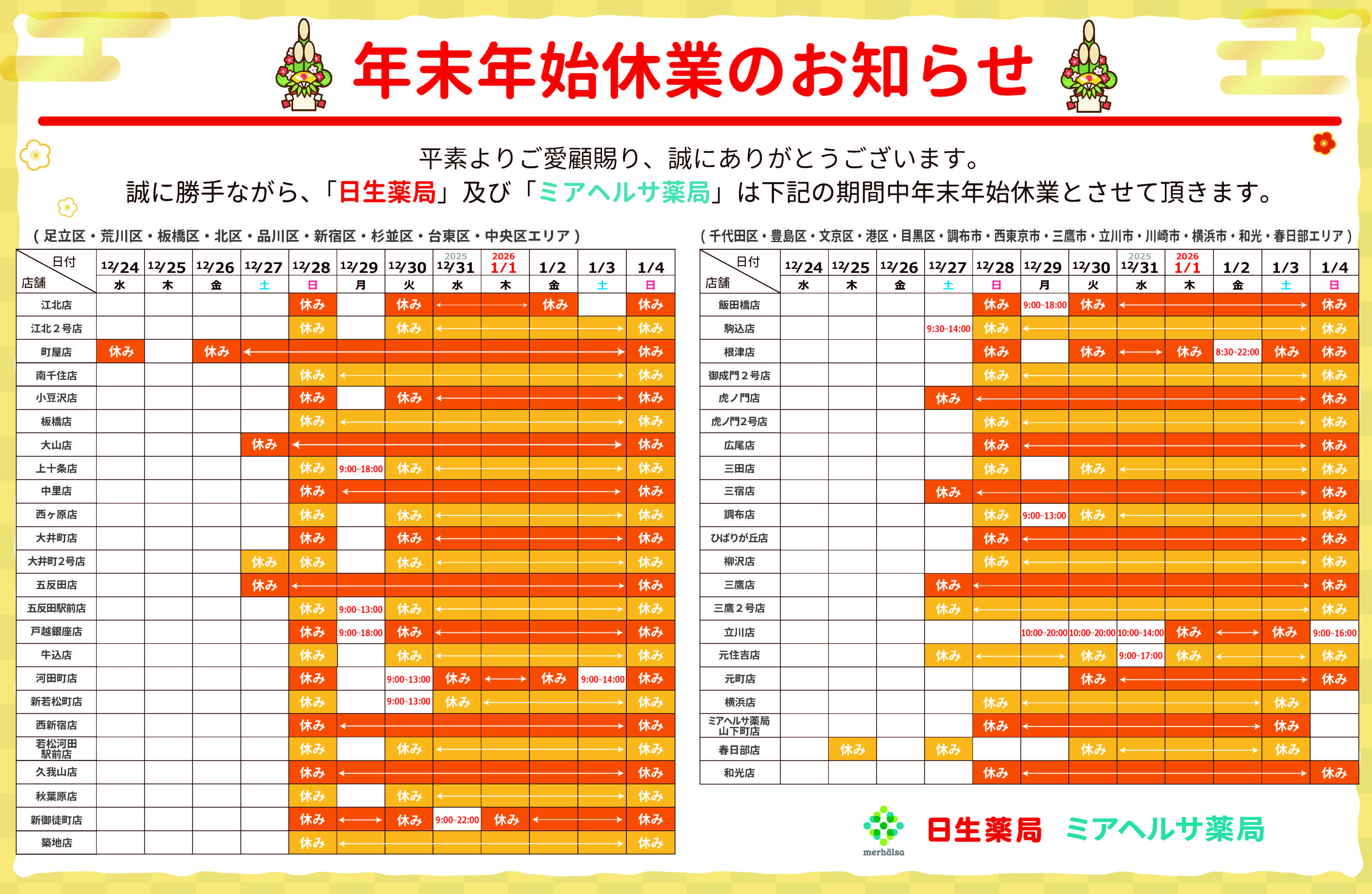 2025年12月12日 日生薬局/ミアヘルサ薬局では年末年始(12/24~1/4)の期間中、誠に勝手ながら休業を含む特別営業にて対応させていただきます。 各店の詳細な営業予定につきましては下記の表をご覧ください。 ご不便ご迷惑をおかけいたしますが、何卒ご理解のほどよろしくお願い申し上げます。 <画像をクリックするとPDFファイルが開きます。>
