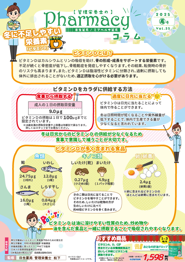 2026年01月05日 管理栄養士による「Pharmacyコラム」および「おすすめレシピ」を更新しました。 2025年4号は、下記よりご確認ください。 ※画像をクリックするとPDFファイルが開きます。 日生薬局・ミアヘルサ薬局では、薬剤師による薬のサポートに加え、管理栄養士による栄養相談を実施し、より充実した健康サポートを行なっています。今後も、患者さまの利便性の向上や医療の質の向上に寄与する取り組みを積極的に進めてまいります。
